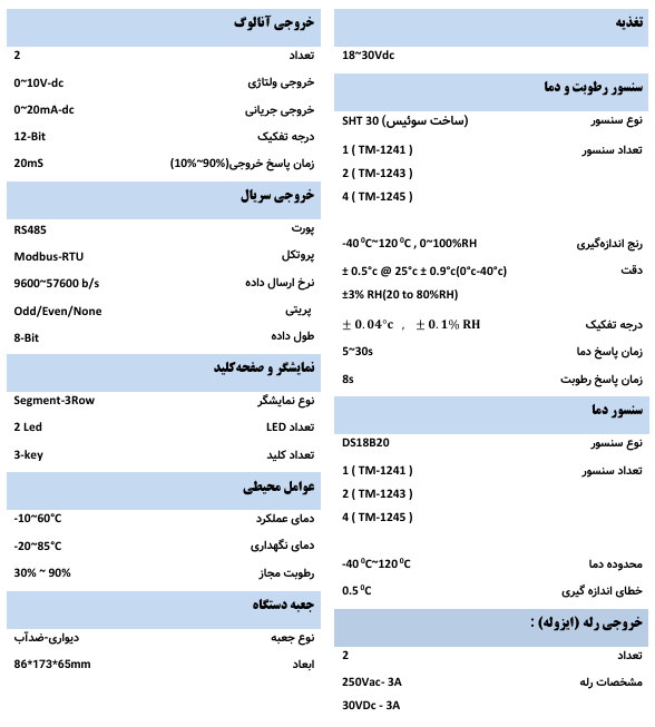 دستگاه ترانسمیتر رطوبت و دما TM-1241 توسط یک سنسور کاليبره شده ساخت سوئيس قادر به اندازه گيری رطوبت درمحدوده 0~100% و دما درمحدوده (-30~130° c)می باشد .این دستگاه علاوه بر اندازه گيري رطوبت و دما قابلیت اندازه گیری نقطه شبنم را دارد.همچنین دستگاه دارای نمایشگر 3 ردیفه از نوع سون سگمنت و 2 کانال خروجی دیجیتال (به صورت رله) یا 2 کانال خروجی آنالوگ می باشد.