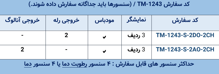 دستگاه ترانسمیتر رطوبت و دما TM-1243 توسط دو سنسور کاليبره شده ساخت سوئيس قادر به اندازه گيری رطوبت درمحدوده 0~100% و دما درمحدوده (-30~130° c)می باشد .این دستگاه علاوه بر اندازه گيري رطوبت و دما قابلیت اندازه گیری نقطه شبنم را دارد.همچنین دستگاه دارای نمایشگر 3 ردیفه از نوع سون سگمنت و 2 کانال خروجی دیجیتال (به صورت رله) یا 2 کانال خروجی آنالوگ می باشد.