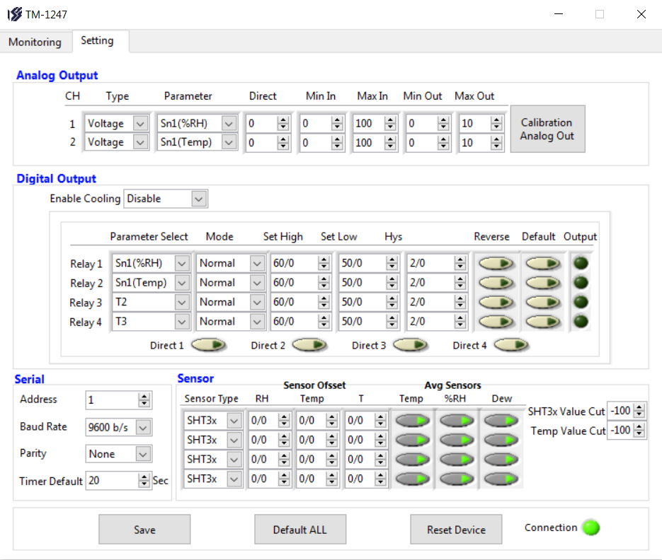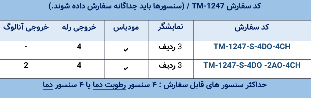 دستگاه ترانسمیتر پیشرفته رطوبت و دما TM-1247 توسط چهار سنسور کاليبره شده ساخت سوئيس قادر به اندازه گيری رطوبت درمحدوده 0~100% و دما درمحدوده (-30~130° c)می باشد .این دستگاه علاوه بر اندازه گيري رطوبت و دما قابلیت اندازه گیری نقطه شبنم را دارد.همچنین دستگاه دارای نمایشگر 3 ردیفه از نوع سون سگمنت و 4 کانال خروجی دیجیتال (به صورت رله) یا 4 کانال خروجی آنالوگ می باشد.