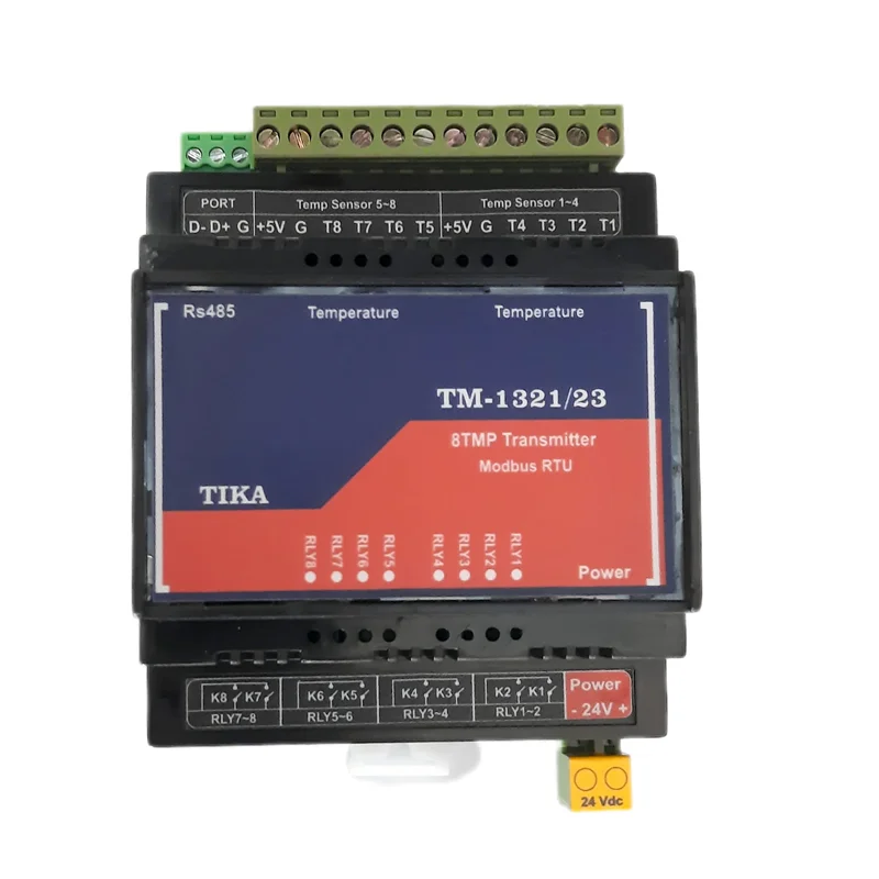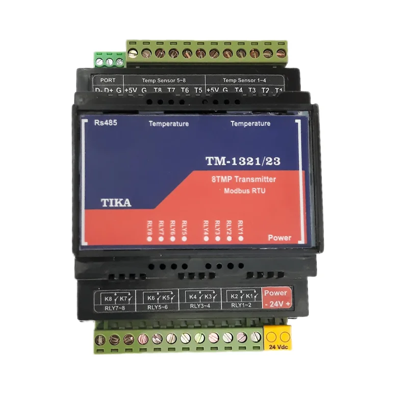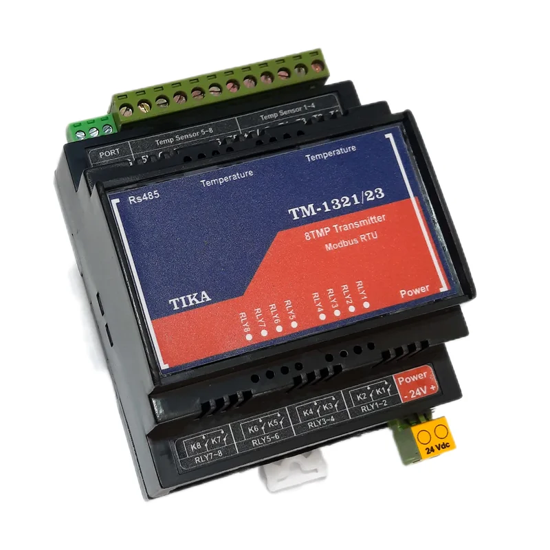 این مدل از ترانسمیتر دما به طور همزمان به 8 سنسور دمای دیجیتال وصل شده ، به نحوی که با اندازه گیری دمای 8 نقطه گوناگون و ارسال مقادیر آن به راه دور می توان دما های متعدد یک فرایند صنعتی را مانیتور کرد. همینطور مدل TM-1323 این ترانسمیتر دارای 8 رله بوده که با آن می توان 8 فرمان قطع و وصل را برای یک فرایند صنعتی صادر کرد تا بدین ترتیب فرایندهای گوناگون سرمایشی یا گرمایشی را در یک مجموعه کنترل و نظارت کرد.